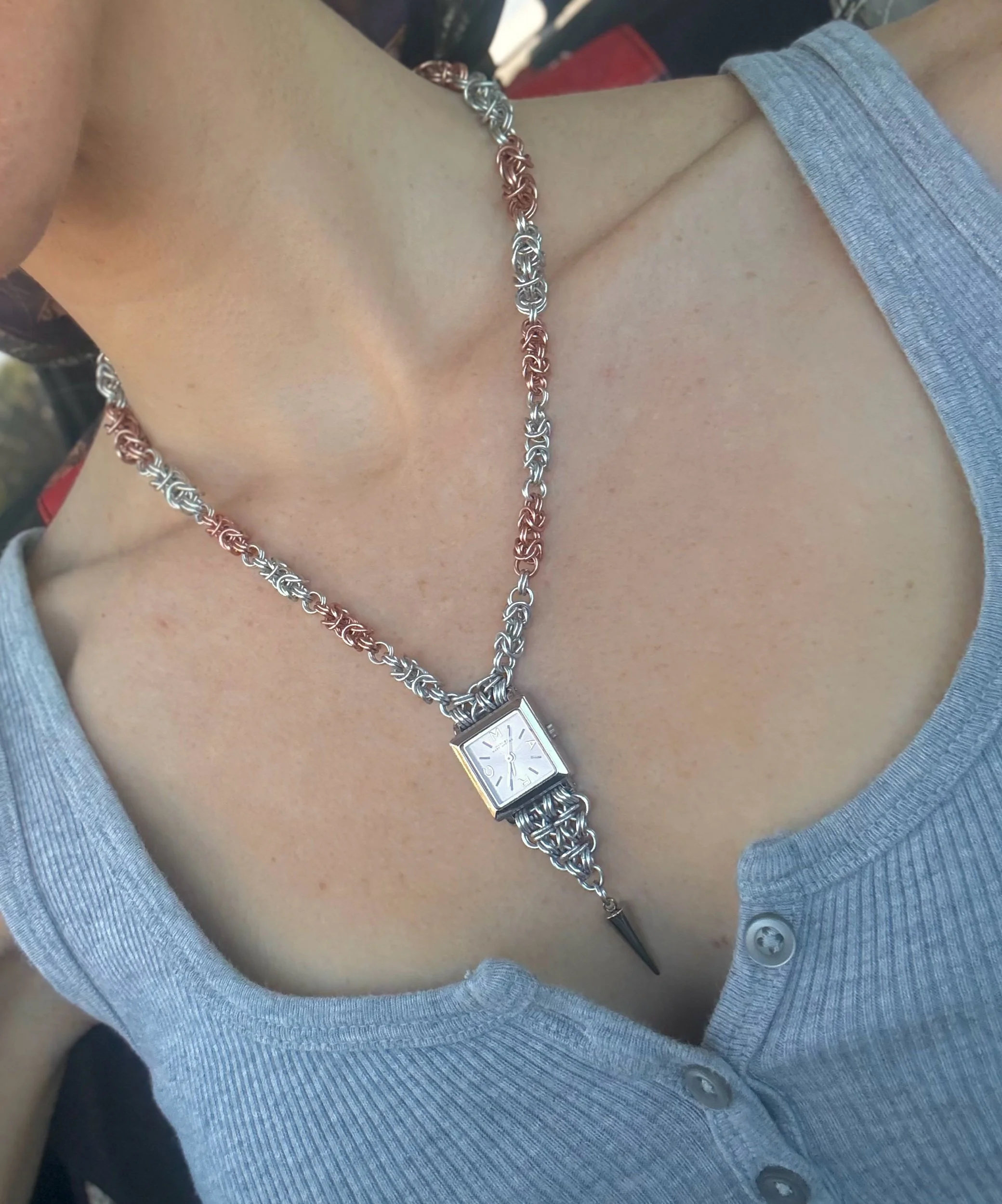 Handmade watch chainmail necklace.